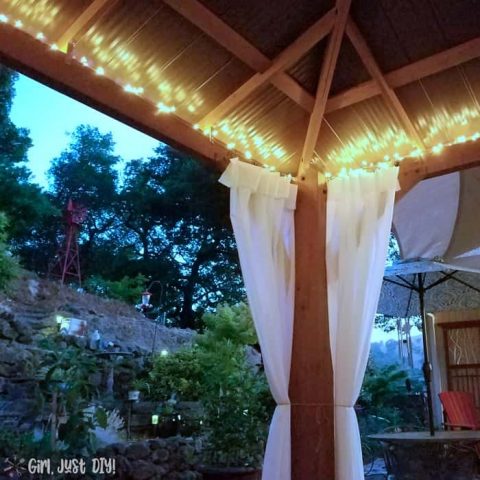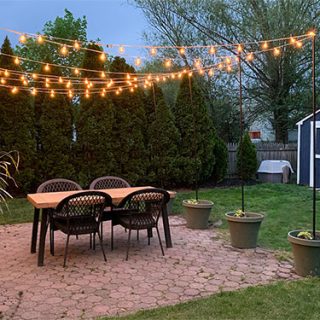Lighting makes such a difference in a backyard space. See how to add an arbor of string lights to your patio or backyard. This simple backyard idea will make your patio look like a pergola in no time!