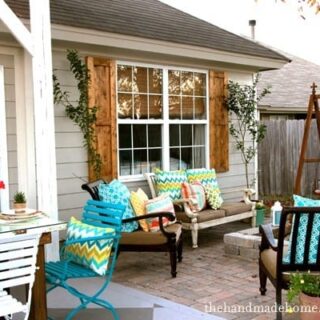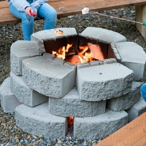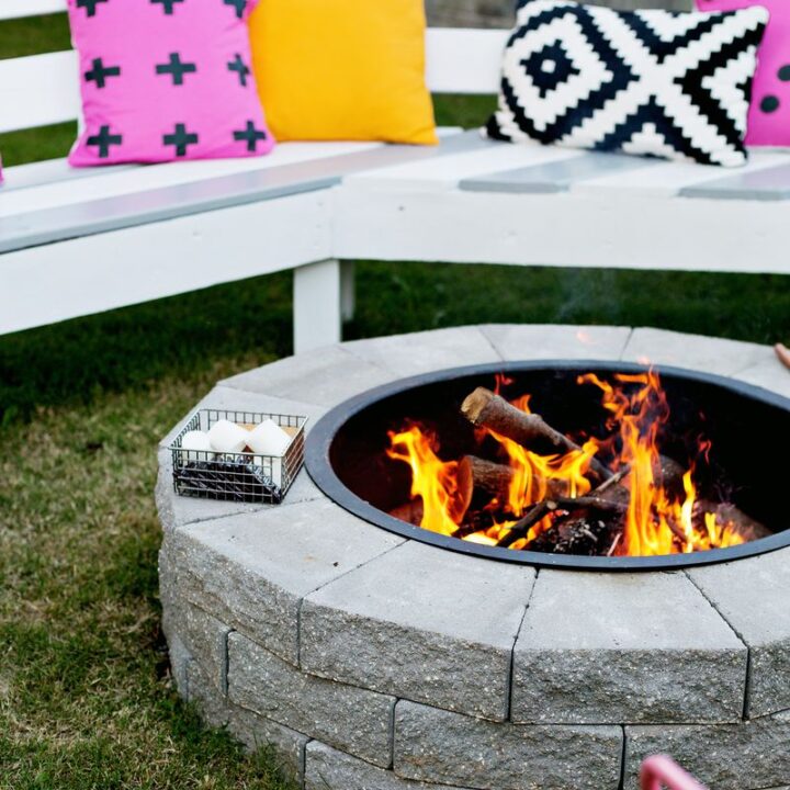 Use inexpensive pavers to make a beautiful outdoor fire pit and see how to add built-in seating too!