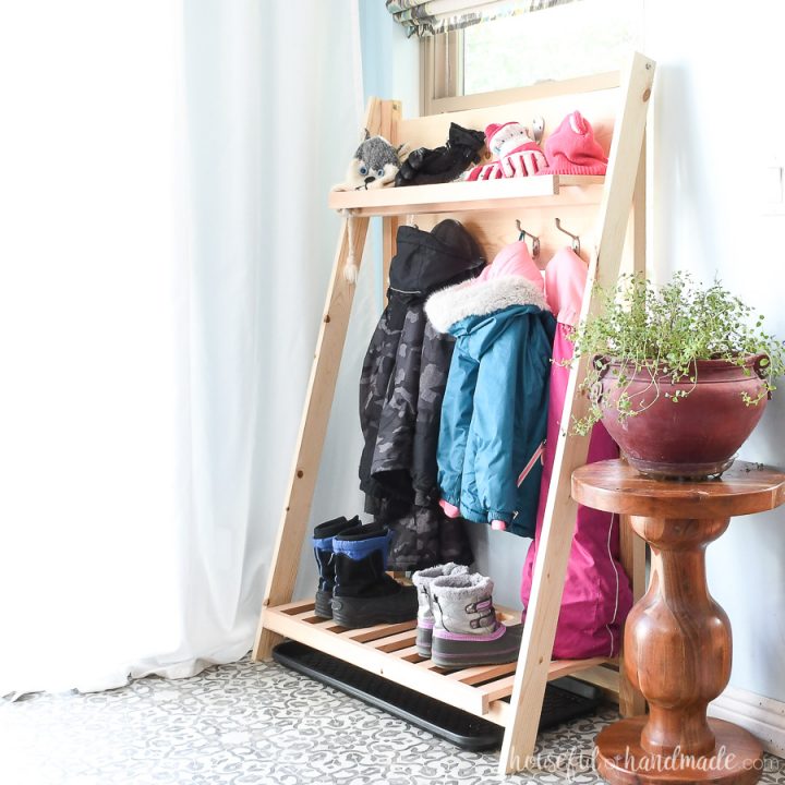 Build these collapsible storage shelves to give you extra storage in your entryway or mudroom. They take up little space, but add extra storage for shoes and coats as well. Then fold flat when you don't need them.