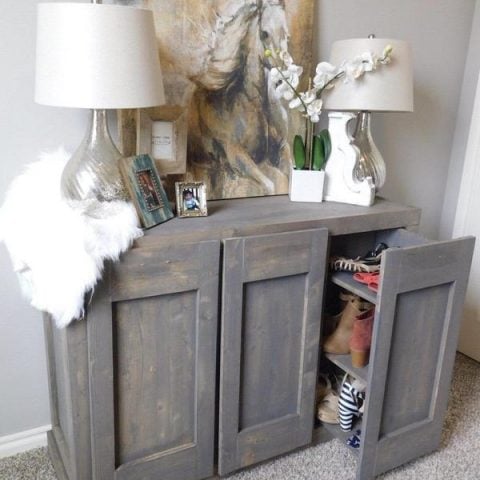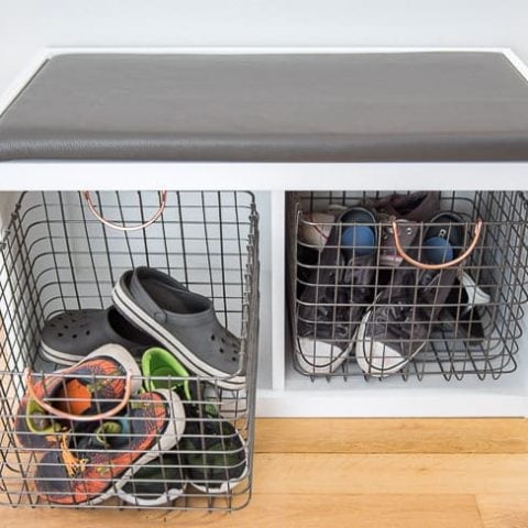 This DIY shoe shelf storage bench is such a good ideas. Not only does it store the shoes, but you can sit down to put your shoes on before you head out in the morning!