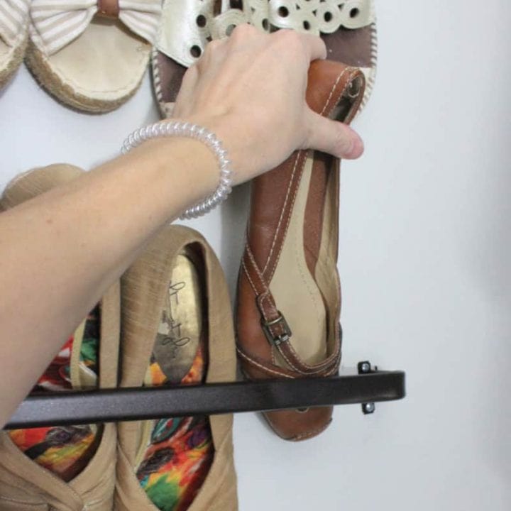 You will love this DIY shoe storage hack- using curtain rods! It can be used inside a small closet to hold shoes and even scarves!