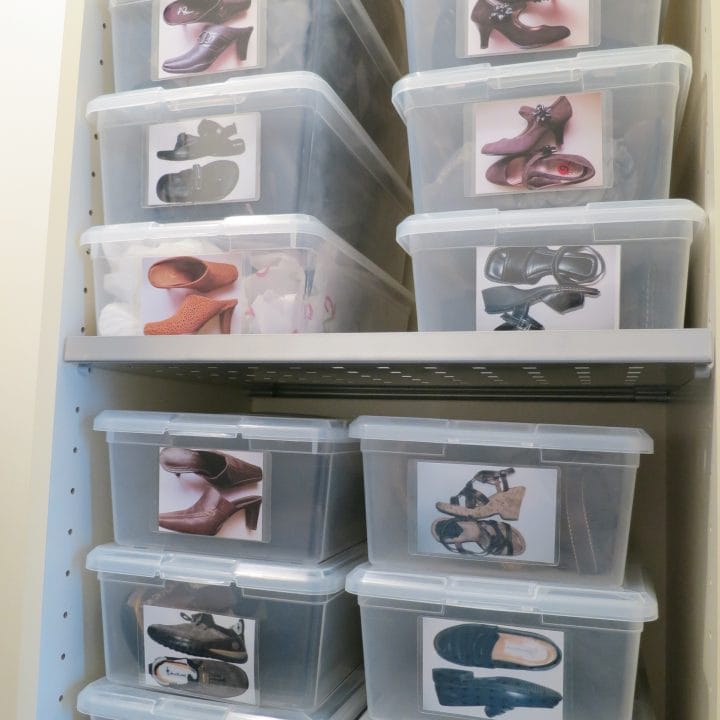 These shoe storage boxes are so neat and tidy! Pick up some plastic storage containers, self laminating cards and create this simple, but clever, shoe storage idea.