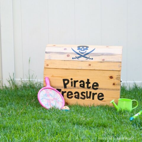 Turn all your toys into burried treasure by storing them in this pirate treasure chest! Perfect for storing toys in a playroom or even for outside toy storage.