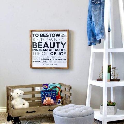 These DIY kids organizer ideas are made from upcycled wine crates and have a rustic vibe that will also look great in a kids playroom. It's on wheels so you can move it from room to room.