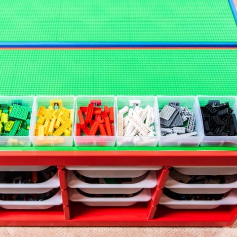 This IKEA toy storage lego table is amazing! What kid wouldn't want this in his or her playroom? There is a ton of storage for all of the various pieces with DIY sliding toy storage bins. Step by step instructions are included to make your own!