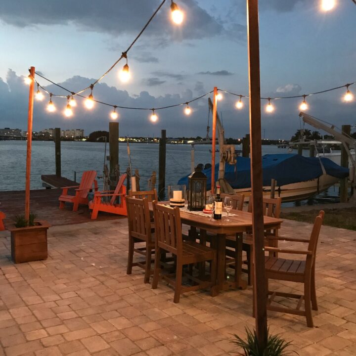 These DIY outdoor string lights on poles are moveable, which is great for entertaining.